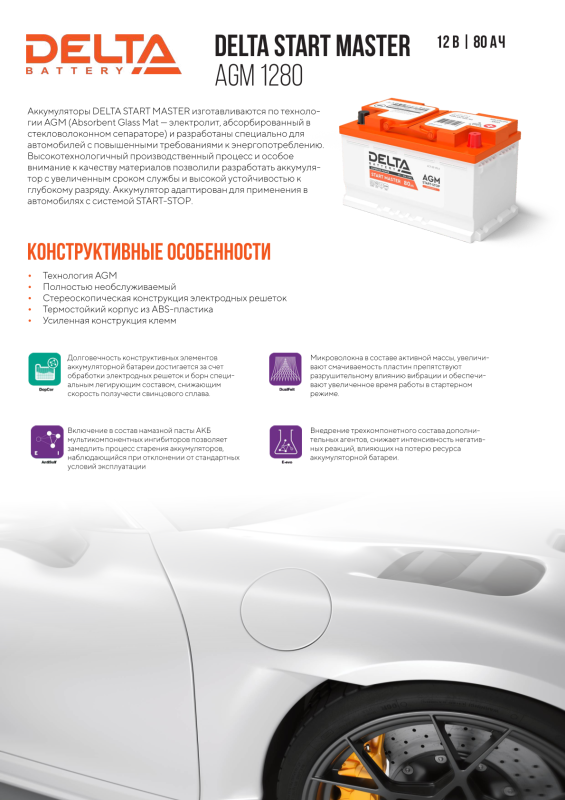 DELTA START MASTER изготавливаются по технологии AGM (Absorbent Glass Mat — электролит, абсорбированный в стекловолоконном сепараторе) и разработаны специально для автомобилей с повышенными требованиями к энергопотреблению.