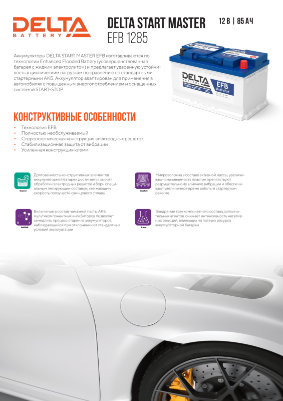Автомобильный аккумулятор DELTA EFB предназначен для ряда европейских моделей машин.