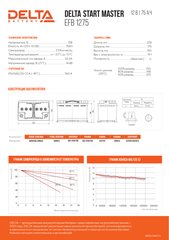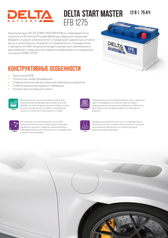 Стартерный автомобильный аккумулятор DELTA Start Master EFB предназначен для ряда европейских моделей машин. АКБ изготовлен по технологии EFB. Применяют при наличии системы Старт-стоп, Webasto , увеличенном энергопотреблении.