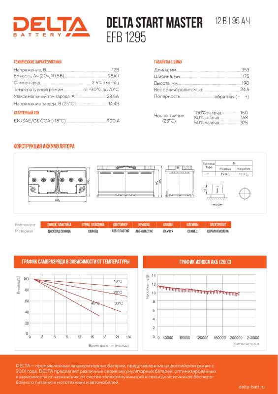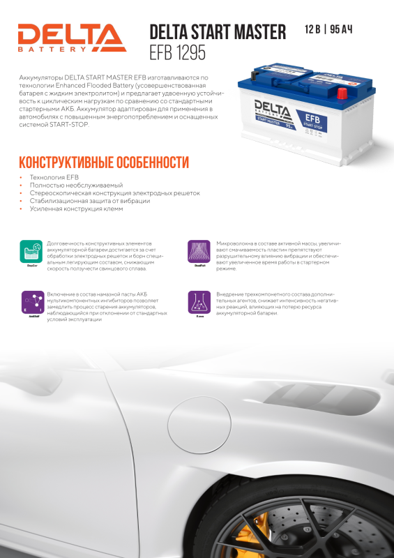 DELTA START MASTER EFB изготавливаются по технологии Enhanced Flooded Battery (усовершенствованная батарея с жидким электролитом - адаптирован для применения в авто с повышенным энергопотреблением и оснащенных системой START-STOP.
