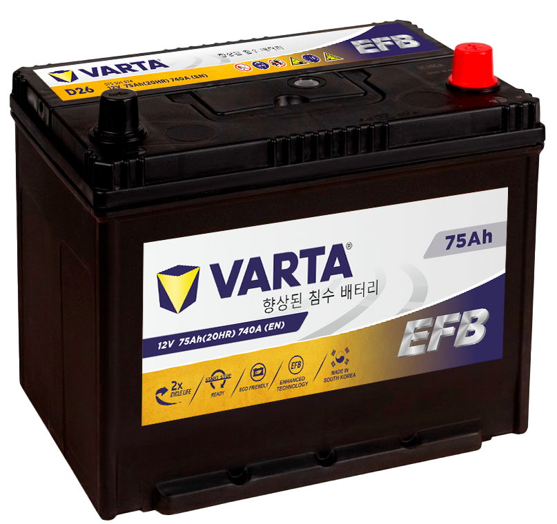 Аккумуляторная батарея VARTA EFB относится к новому поколению аккумуляторов, изготовленных с применением технологии EFB, т.е. усовершенствованная батарея с жидким электролитом. По сравнению с обыкновенной залитой батареей имеет на пластинах специальную пленку из полиэстера и более толстые пластины. Пленка из полиэстера обеспечивает удержание дополнительного активного материала на пластинах, благодаря чему достигается большая устойчивость к циклам по сравнению с традиционными батареями, а потери активного материала максимально сокращены.
