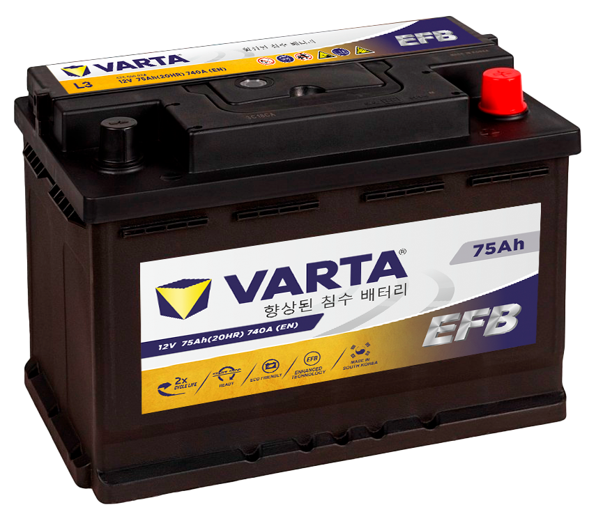 Аккумуляторная батарея VARTA EFB относится к новому поколению аккумуляторов, изготовленных с применением технологии EFB, т.е. усовершенствованная батарея с жидким электролитом. По сравнению с обыкновенной залитой батареей имеет на пластинах специальную пленку из полиэстера и более толстые пластины , таких батарей в два раза большая устойчивость к циклам по сравнению с обыкновенной стартерной батареей, повышенная зарядная емкость, электролит не вытекает при углах наклона до 55°, хорошая пусковая мощность, увеличенный срок службы и не требует доливки воды в процессе эксплуатации.