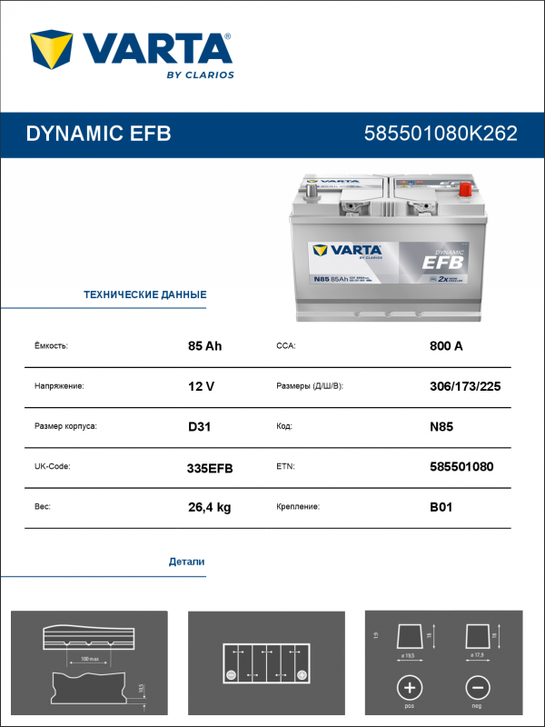 Артикул: Varta_EFB(New)_N85_85R