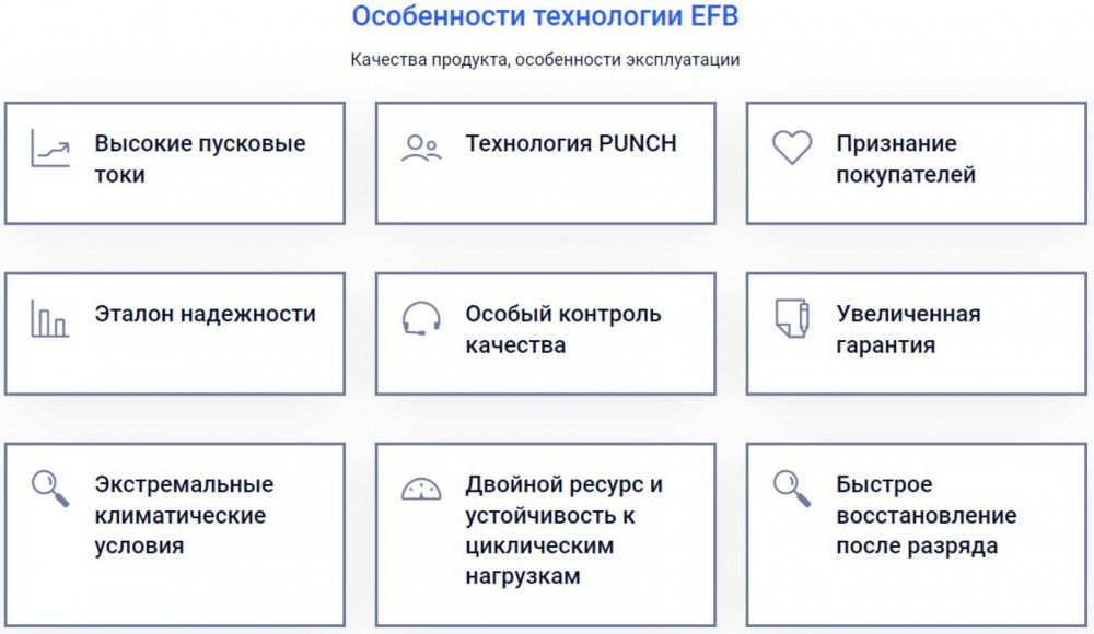 Технология EFB (Enhanced Flooded Battery) подразумевает использование утолщенных пластин и специального сепаратора из микроволокна, который удерживает жидкий электролит. Это дает следующие преимущества: