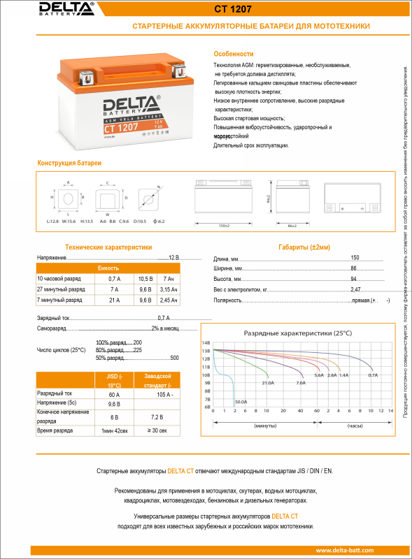 Аккумулятор для мототехники DELTA CT 1207 7Ач 105A прям. пол. 150x86x94 (YTX7A-BS)