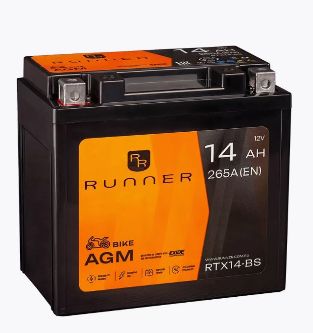 Аккумулятор для мототехники RUNNER AGM 14Ah 265А прям. пол. 150x87x145 (RTX14-BS, YTX14-BS, YTX14H-BS)