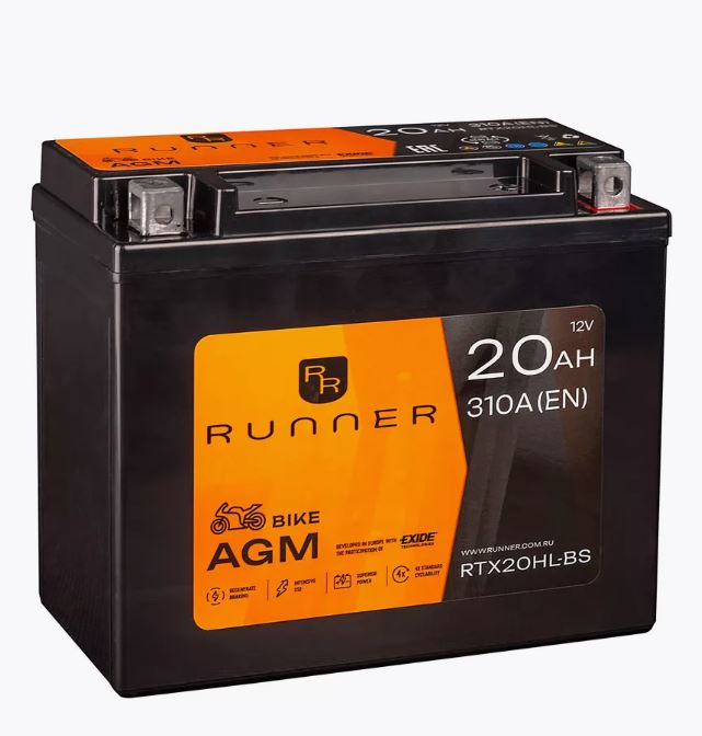 Аккумулятор для мототехники RUNNER AGM 20Ah 310А обр. пол. 176x87x154 (RTX20HL-BS, YTX20L-BS, YB18L-A)